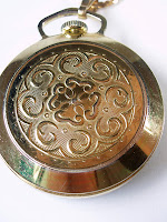 Good condition with minor aging. Pretty design in goldtone with filigree and radials. Probably 1970s.