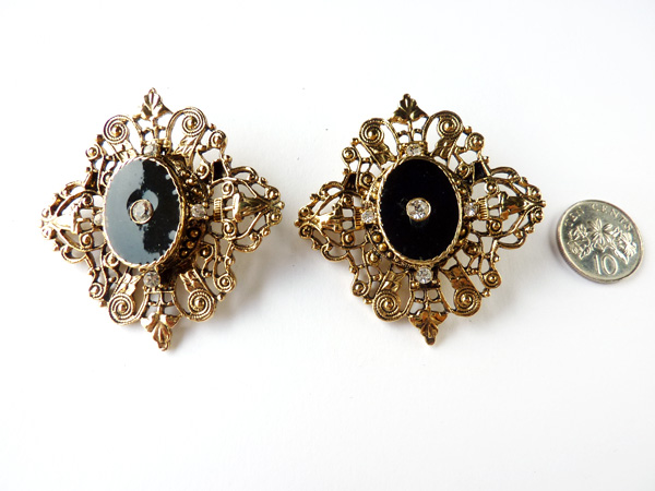 Earrings are in excellent condition, plating still shiny, doesn't look worn. The brooch is in good condition, some scuffs on the surface which is normal, and very minor aging. 1960s.