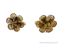 Marked 'W.GERMANY' on both, very good condition though the brass has some dark patina on the front prongs (see photos) and on the earrings' back. The floral cabochons are made of porcelain. Earring clips are still tight. 1960s-70s.